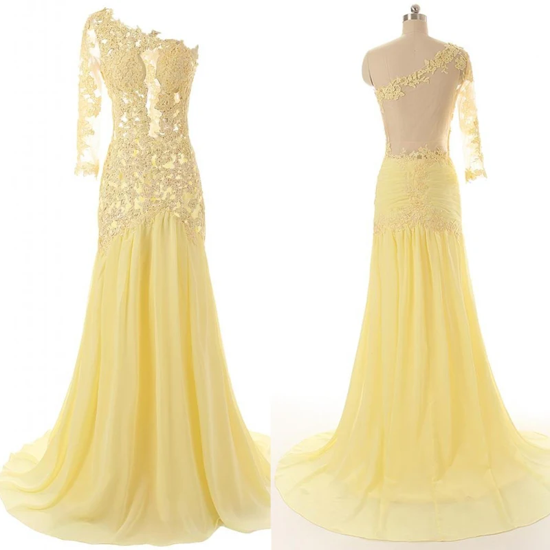 Elegant One Shoulder Long Sleeve Yellow Chiffon Lace Prom Dress