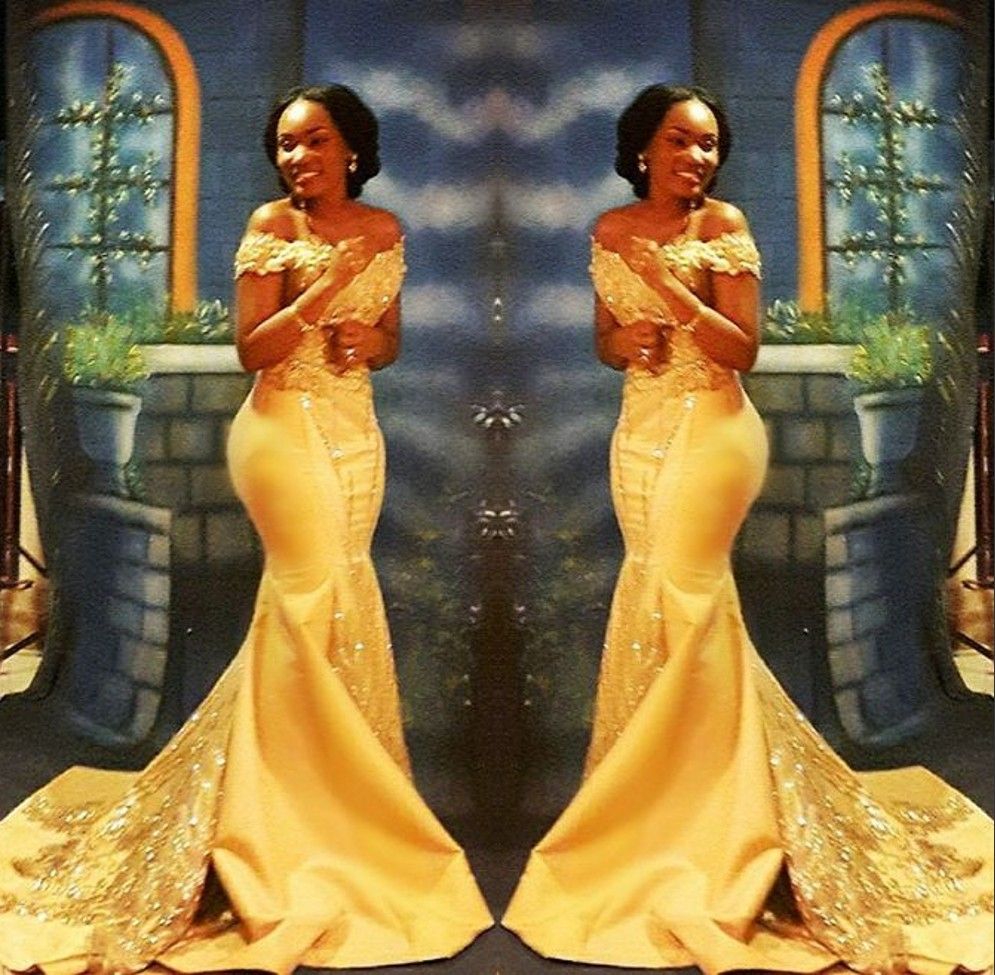 Elegant Off Shoulder Mermaid Yellow Black Girl Prom Dresses Long