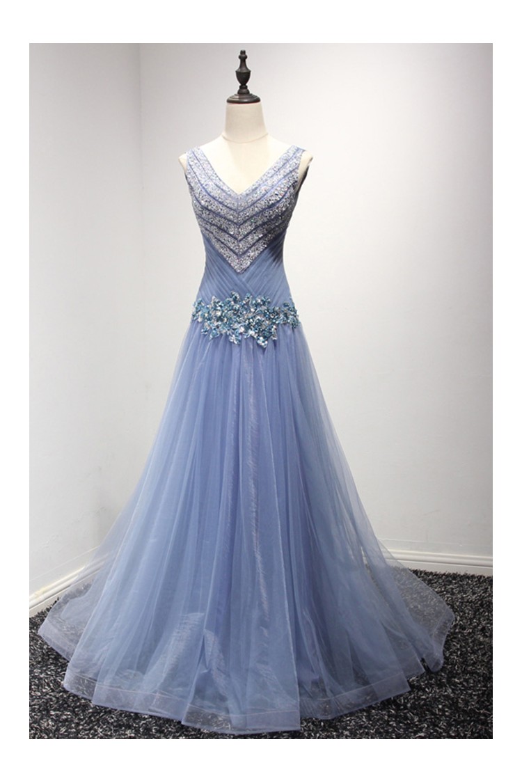 Tight A Line Long Blue Prom Dress With Sparkly Sequined Bodice On