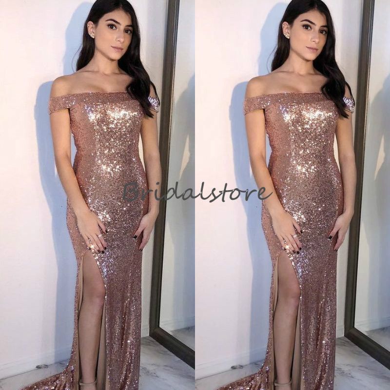 Glitter Rose Gold Long Sequined Prom Dresses Sexy Bateau Slim