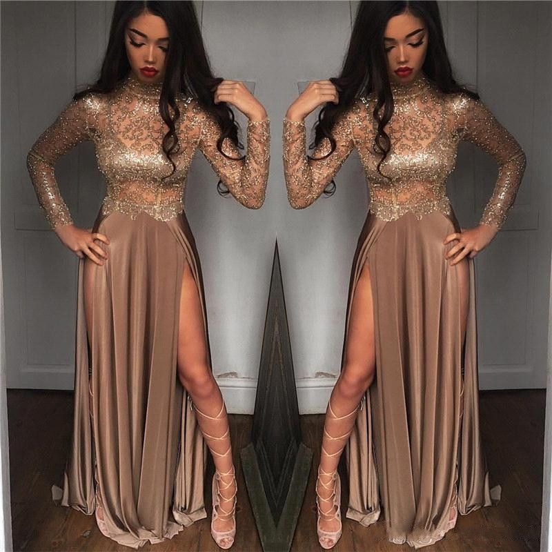 Sparkly Beaded Sequins Long Sleeves Prom Dresses 2018 High Neck
