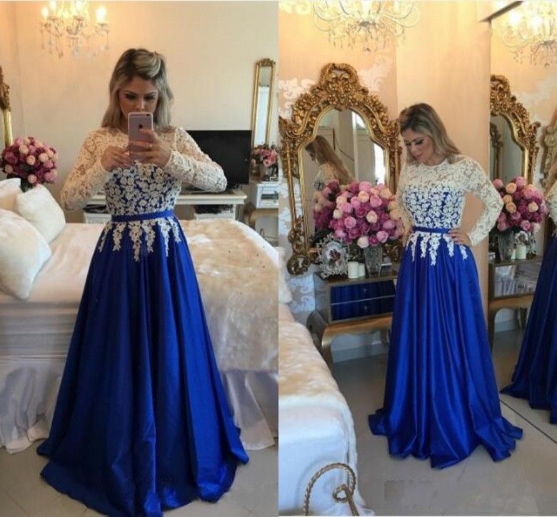 White And Royal Blue Prom Dresses Long Sleeves 2017 Floor Length