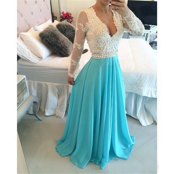 A Line Long Sleeves White Lace Blue Prom Dresses Blue Evening