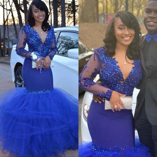 2019 Black Girls Royal Blue Prom Dresses Sheer Long Sleeves
