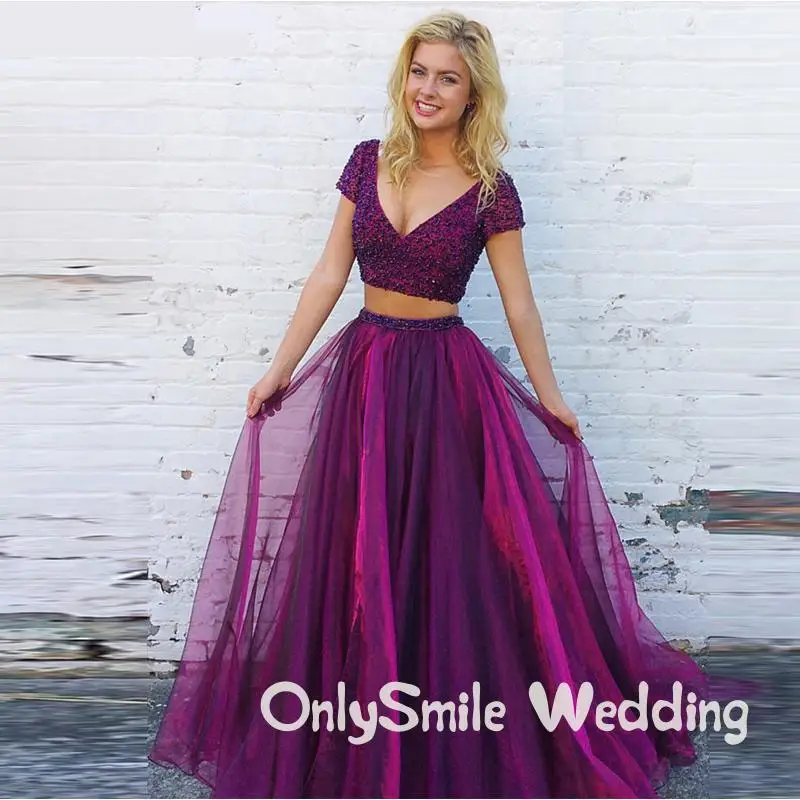 Crop Top Beaded A Line Purple Two Piece Formal Prom Dresses
