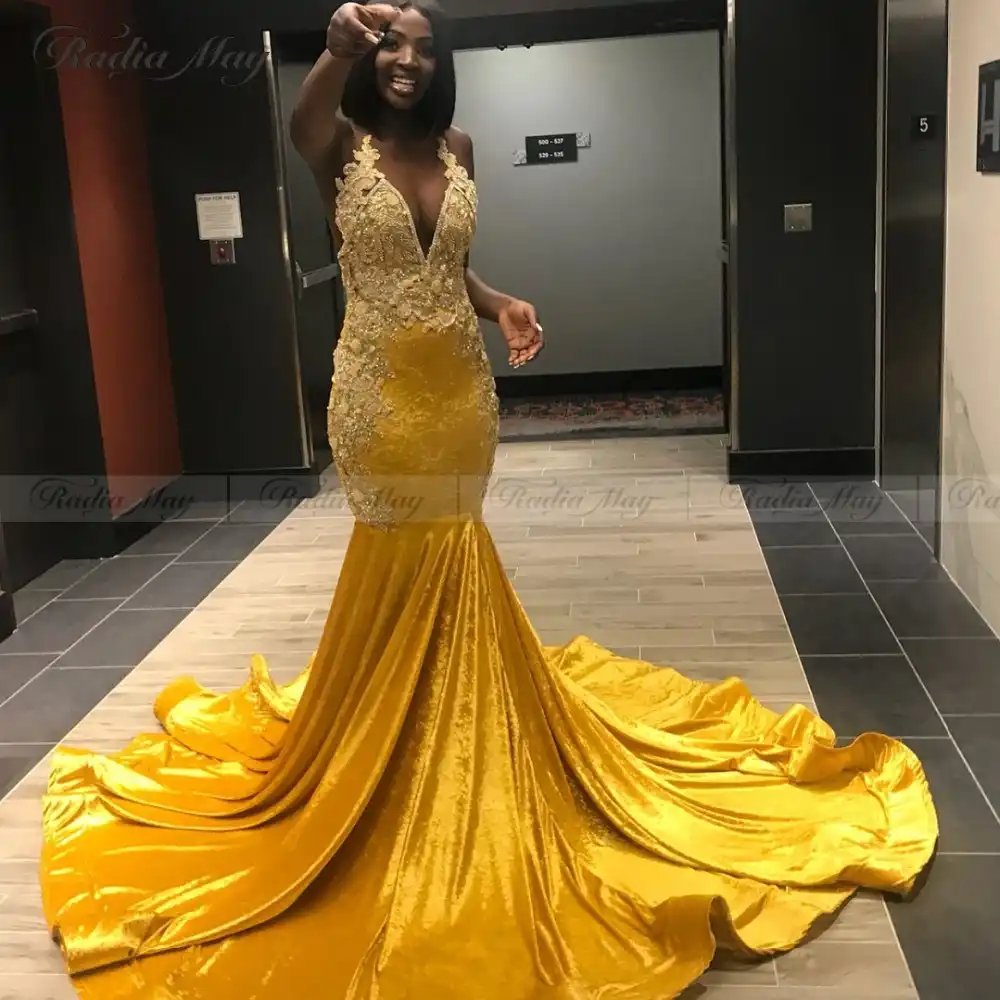 Gold Yellow Velvet Black Girls Mermaid Prom Dresses 2018 Sexy