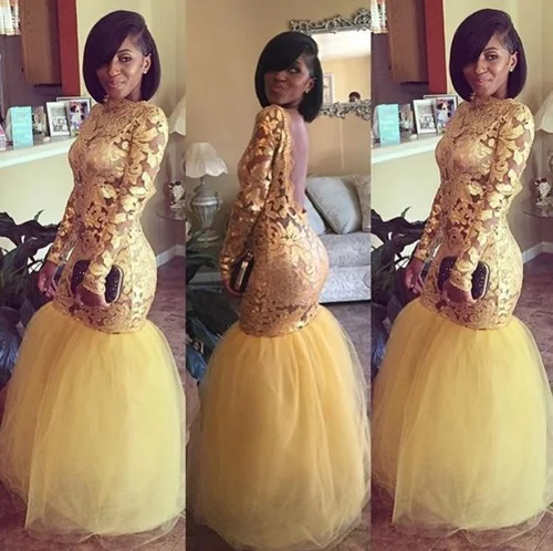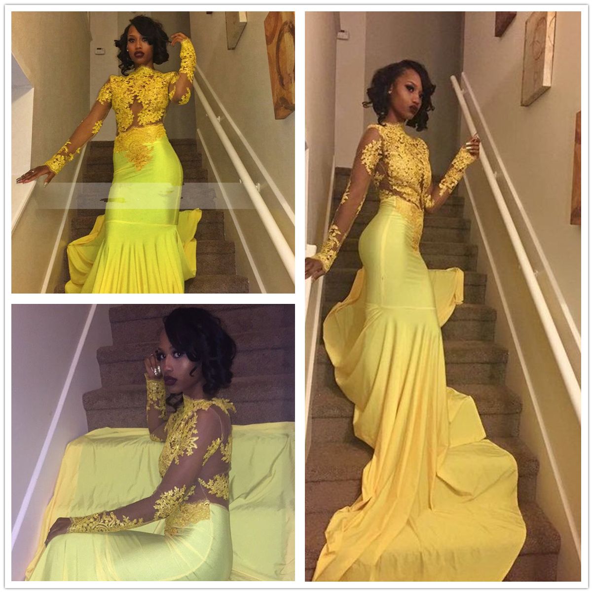 2k17 New Black Girls Illusion Yellow Long Sleeves Satin Mermaid