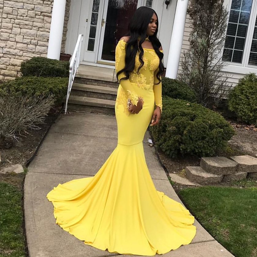 African Black Girls Yellow Mermaid Prom Dress 2019 Lace Applique