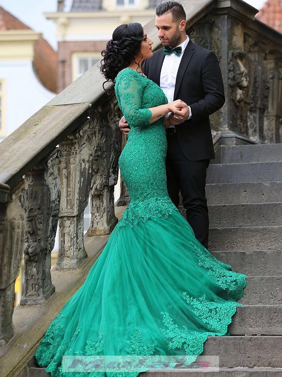 Green Lace Prom Dresses Mermaid Evening Dress 3 4 Long Sleeves