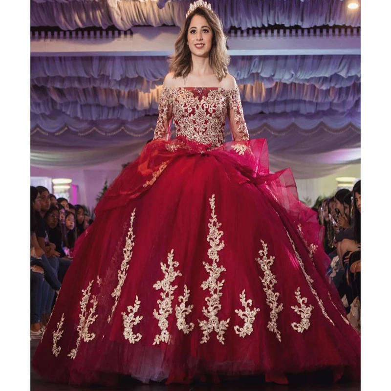 Burgundy Off The Shoulder Gold Appliques Top Long Sleeves Gorgeous