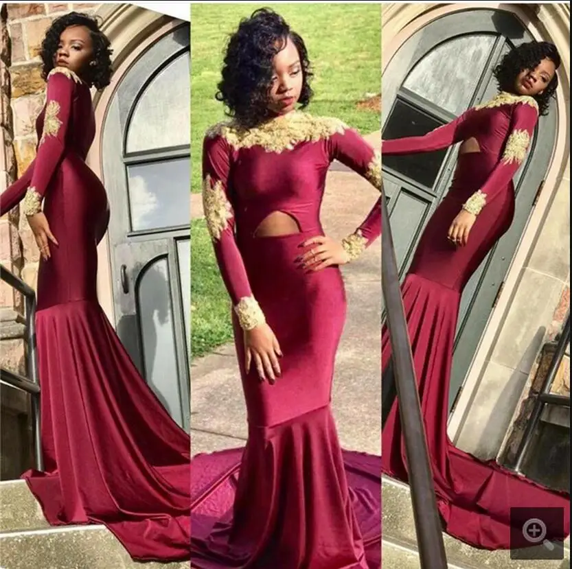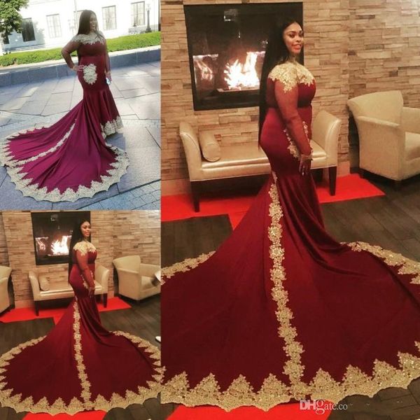 Long Sleeve Burgundy Prom Dresses 2019 Mermaid Gold Evening