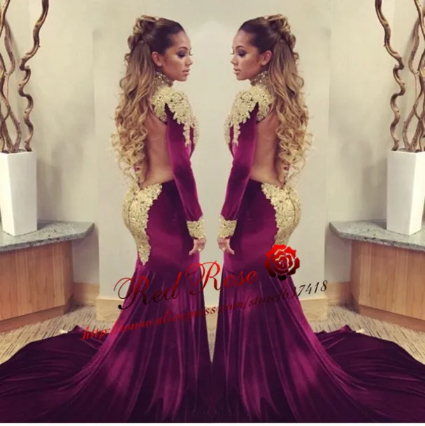2020 Sexy Mermaid Burgundy And Gold Appliques Velvet Long Sleeves