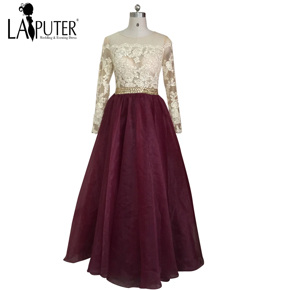 China Long Sleeve Evening Gowns Burgundy Lace Tulle Prom Dresses
