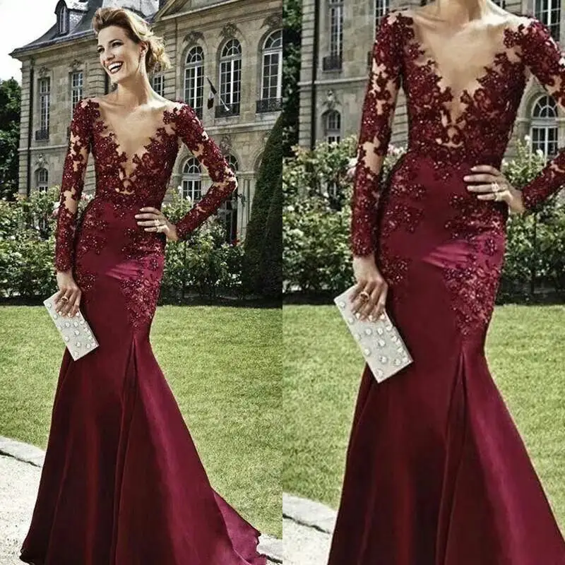 Long Sleeves Lace Burgundy Long Prom Dresses Burgundy Lace Formal