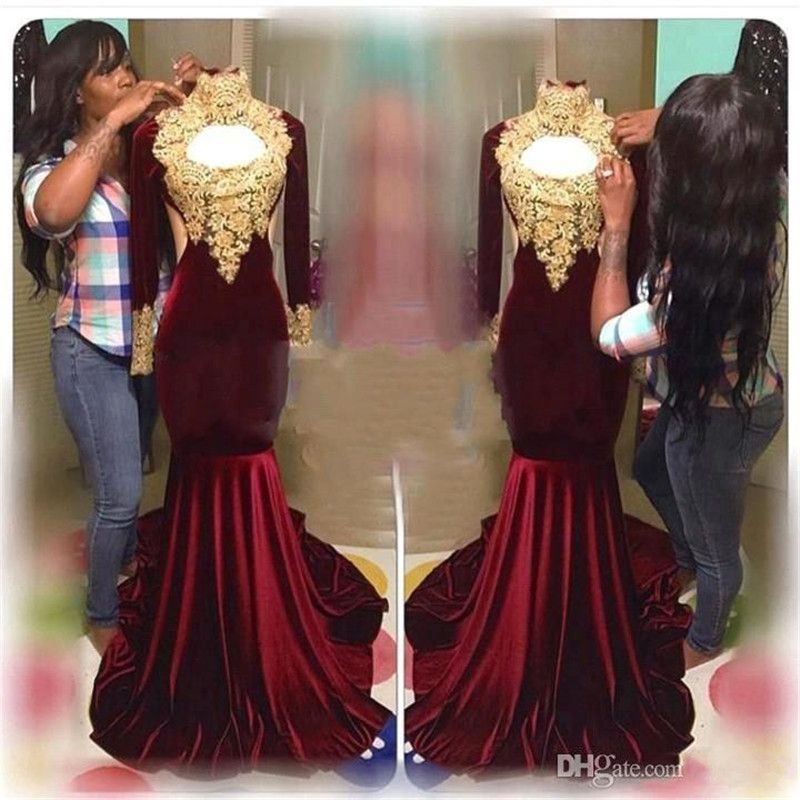 Burgundy Velvet Mermaid Prom Dresses 2019 High Neck Gold Appliques
