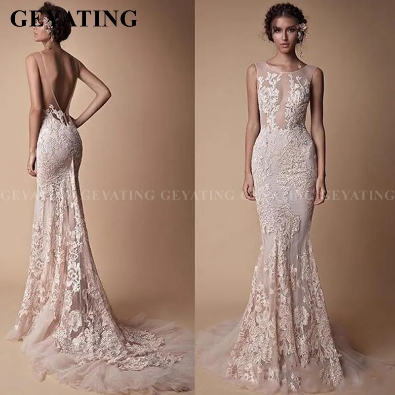 Vintage Lace Champagne Mermaid Evening Dress Backless Long Train