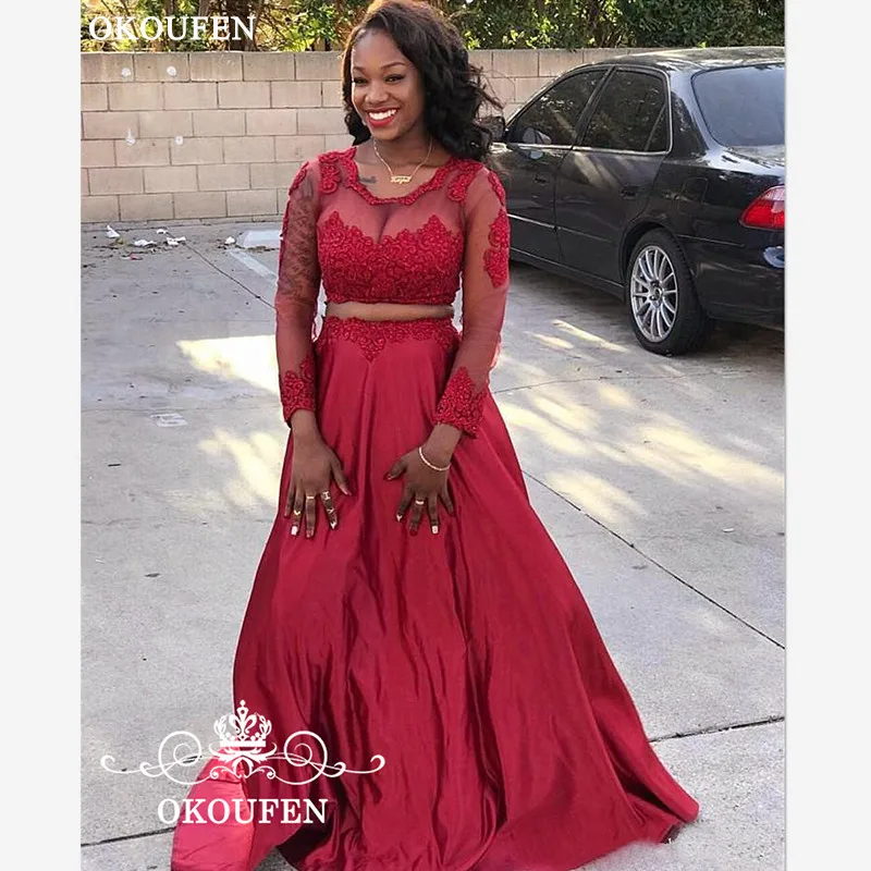 2019 Red Two Piece Crop Top Prom Dresses With Long Sleeves