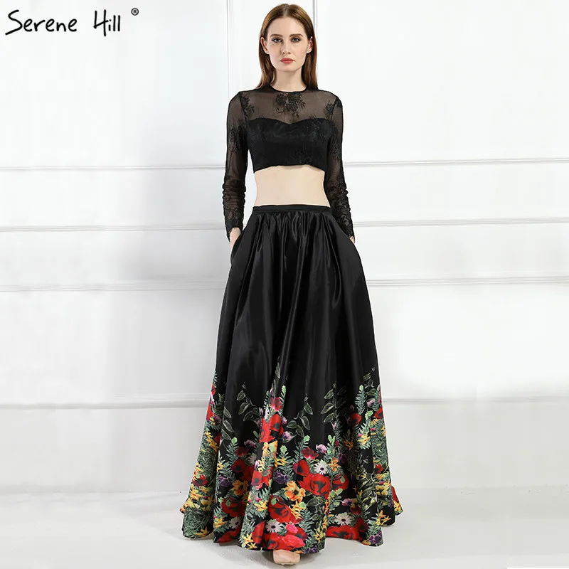 2020 Black Two Pieces Satin Prom Dresses Long Sleeves Pattern