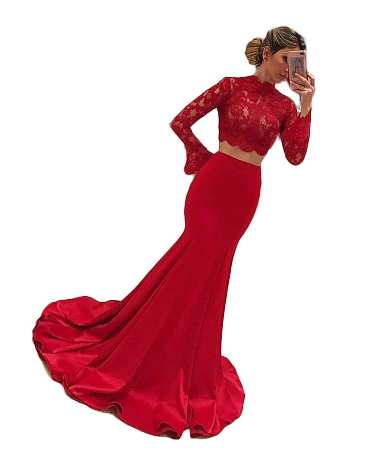 139 99 Red Long Prom Dresses 2019 Mermaid Long Sleeves Two Piece