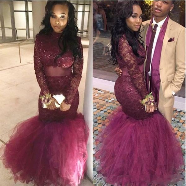 Burgundy Two Piece Lace Prom Dresses 2017 Sheer High Neck Sequined