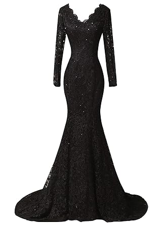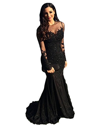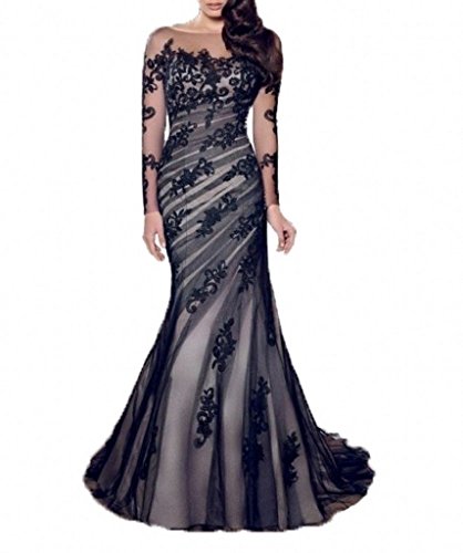 Women S Black Tulle Lace Mermaid Prom Dresses With Long Sleeves