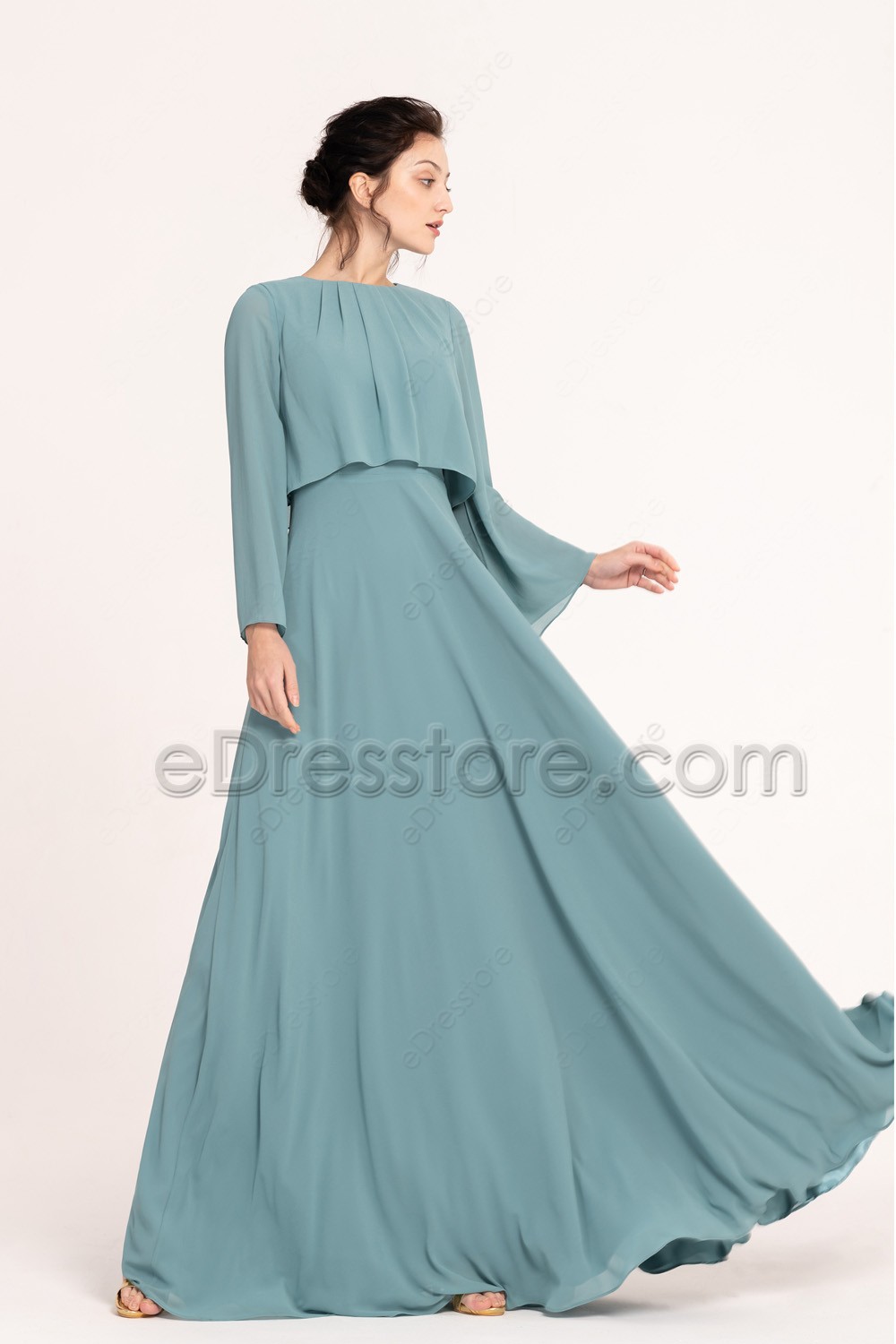 Seaglass Green Popover Modest Bridesmaid Dresses Long Sleeves