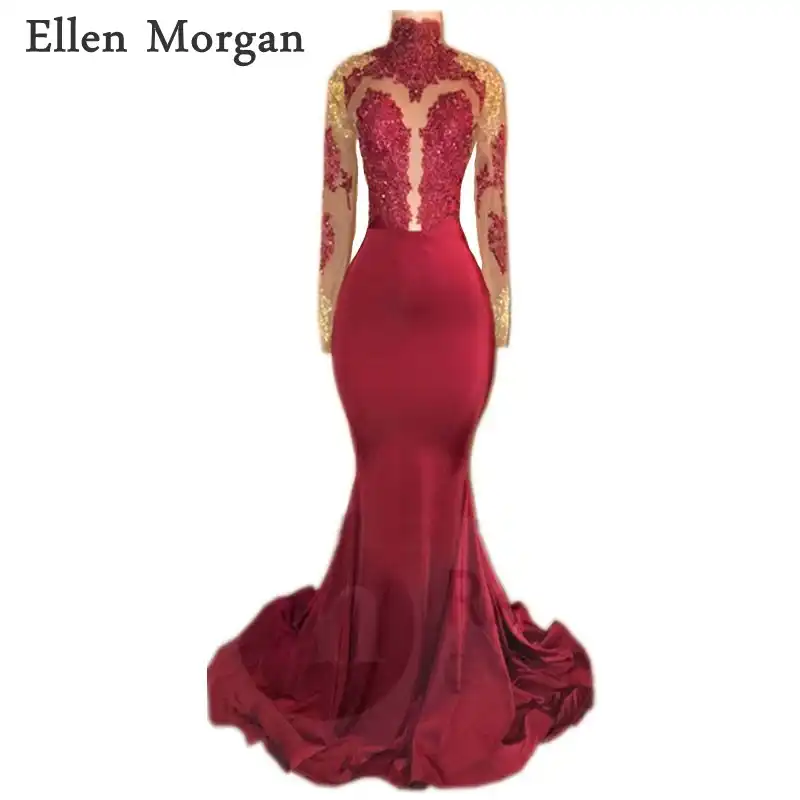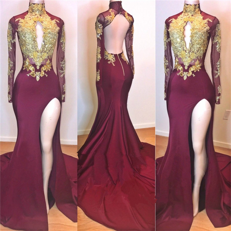 High Neck Gold Appliques Long Sleeve Burgundy Mermaid Prom Dresses