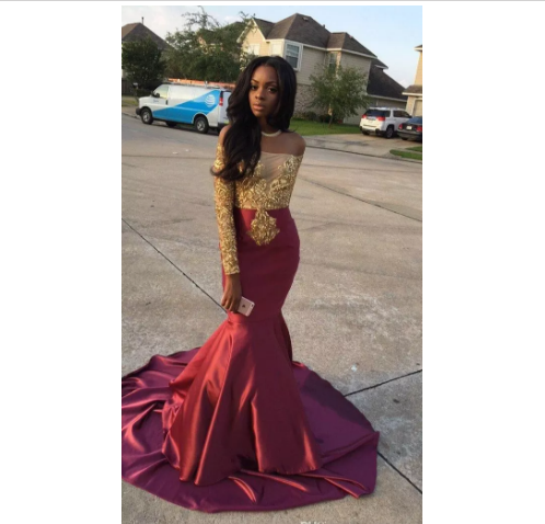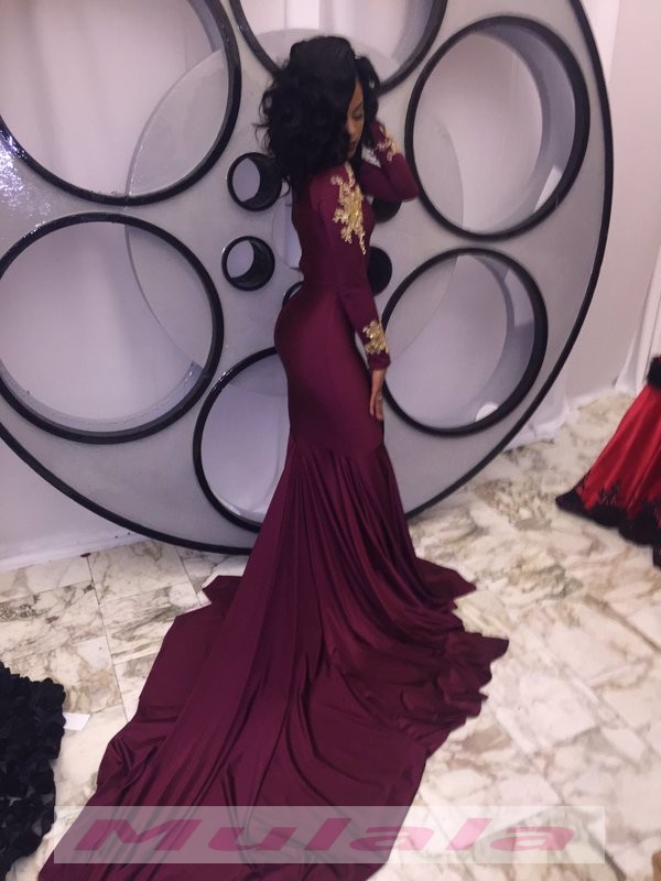 2018 African Burgundy Long Sleeve Gold Lace Prom Dresses Mermaid