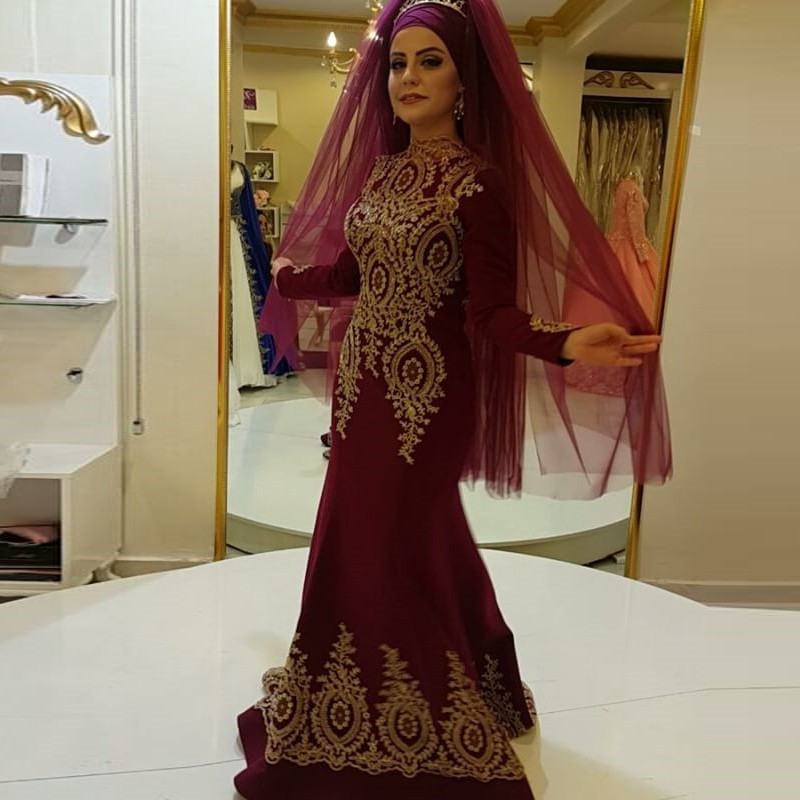 Hot Promo 651f Burgundy Long Sleeves Muslim Evening Dresses