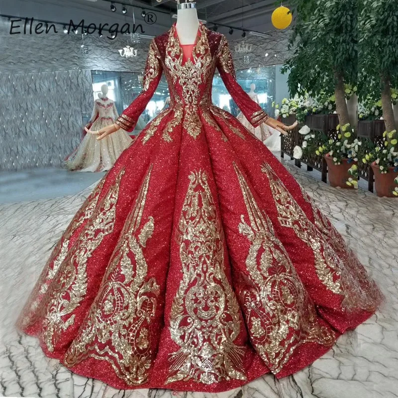 Red And Gold Ball Gown Prom Dress With Long Sleeves Wedding Gown