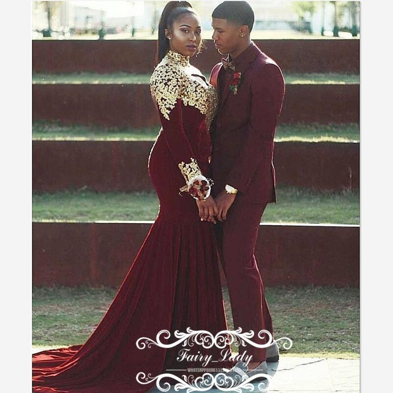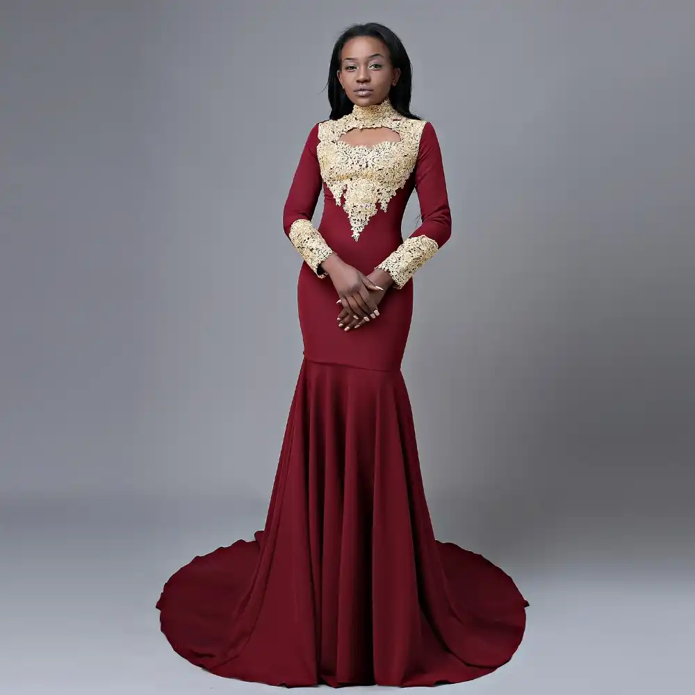African Sexy Burgundy Long Sleeve Mermaid Prom Dress 2020 Gold