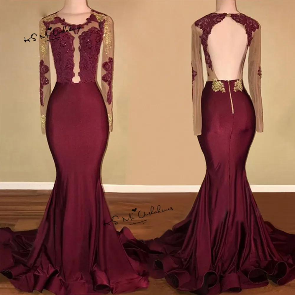 Open Back Keyhole Mermaid Burgundy Gold Appliques Long Sleeves
