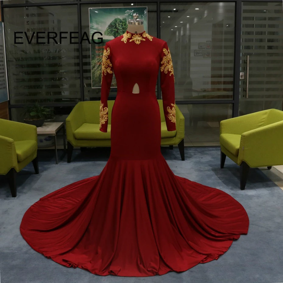 Burgundy Mermaid Long Sleeve Prom Dresses Dubai Kaftan High Neck