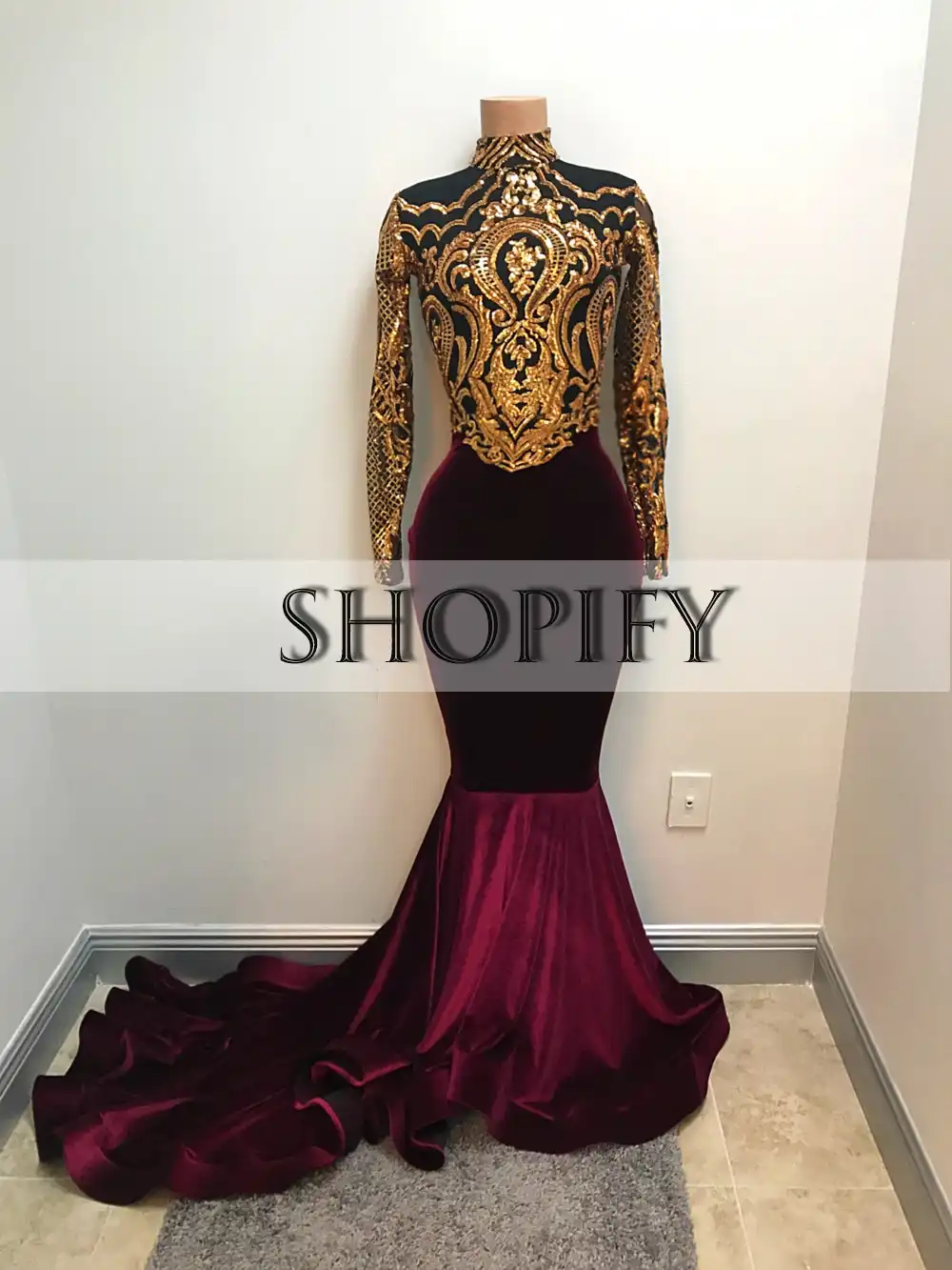 2020 Sexy Mermaid Burgundy And Gold Appliques Velvet Long Sleeves