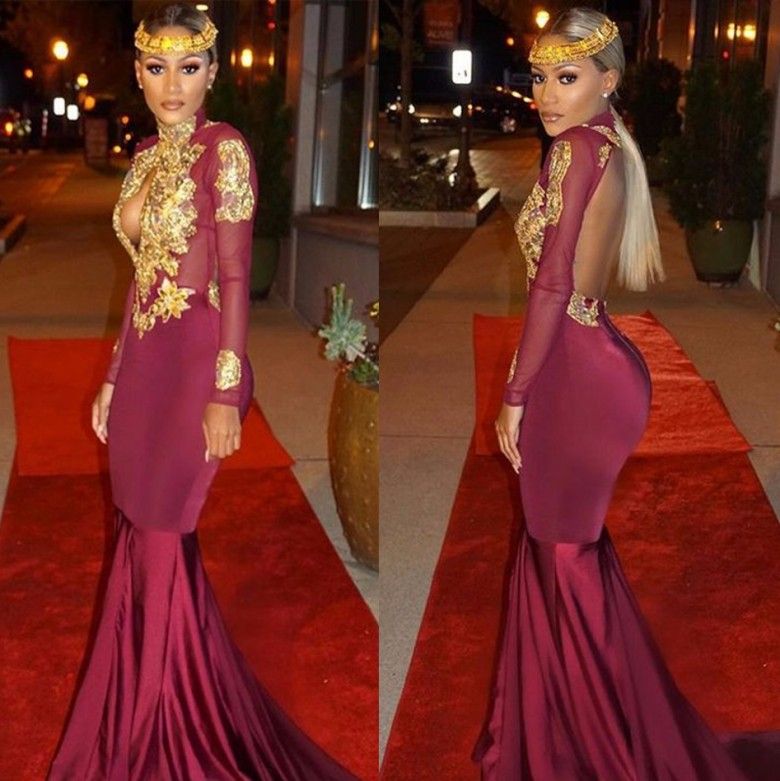 2019 African Burgundy Long Sleeve Gold Lace Prom Dresses Mermaid