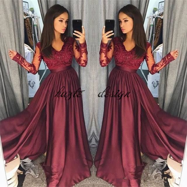 Hot Burgundy Lace Prom Dresses 2018 Sheer Vintage Long Sleeves A