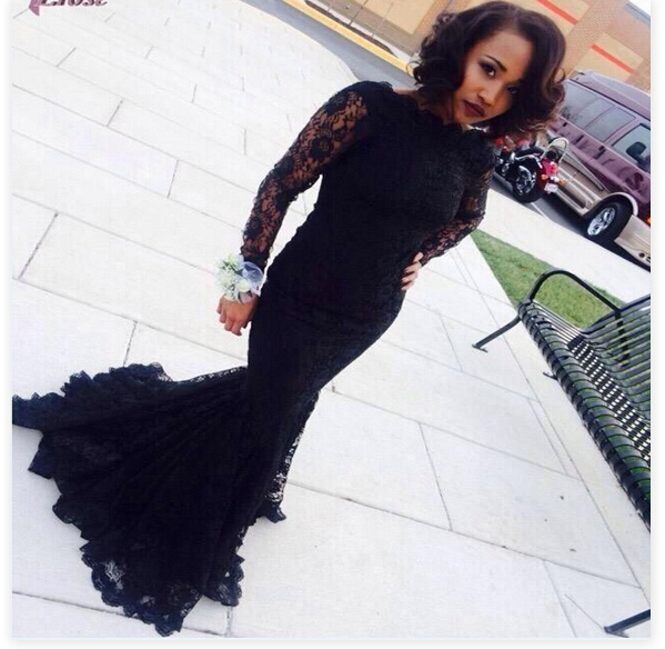 Black Lace Prom Dresses 2018 Mermaid Evening Dress Long Sleeve