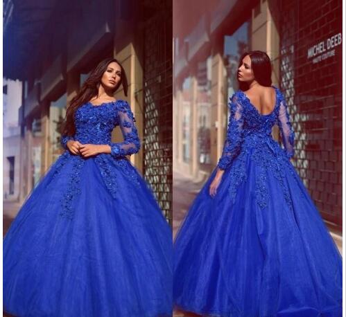 Royal Blue Lace Prom Dresses A Line Long Sleeve Evening Gowns 2020