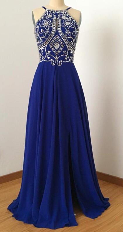 2020 New A Line Chiffon Royal Blue Prom Dresses Front Split Long