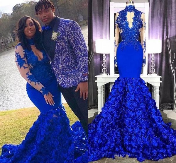 Stunning Royal Blue Prom Dresses 2020 3d Rose Flower High Neck