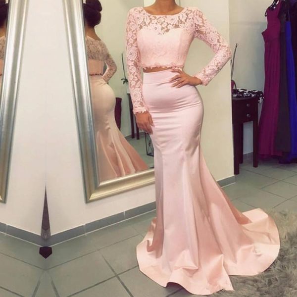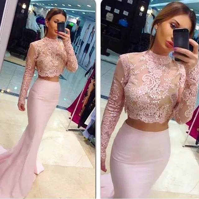163 99 Pink Long Prom Dresses 2019 Mermaid Long Sleeves Two Piece