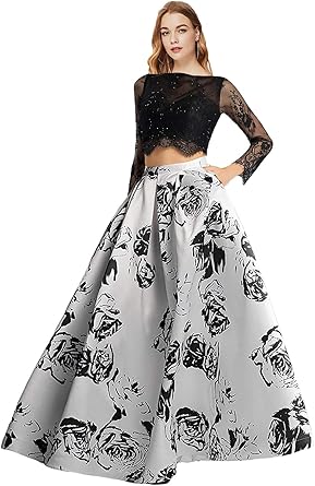 Mkbridal Womens Two Piece Long Sleeve Prom Dresses 2019 Lace Tulle