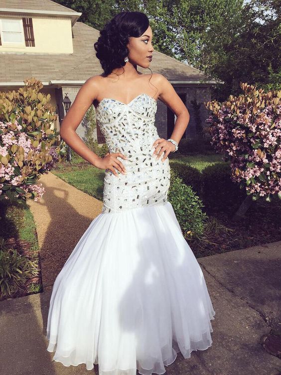 White Mermaid Evening Dresses Beading Crystals Prom Dress Sexy