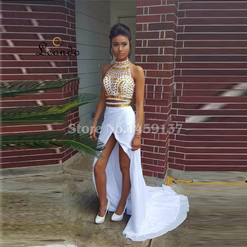 White Two Piece Sheath Brush Train Sleeveless Beading Prom Dress