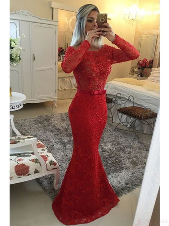 Long Sleeves Red Lace Mermaid Evening Prom Dresses Cheap Custom