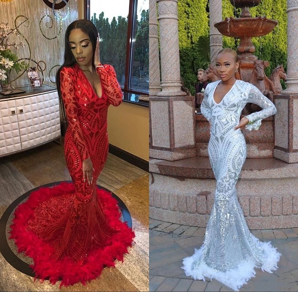 Red Sequin Feather Long Sleeve Mermaid Prom Dress Promfy