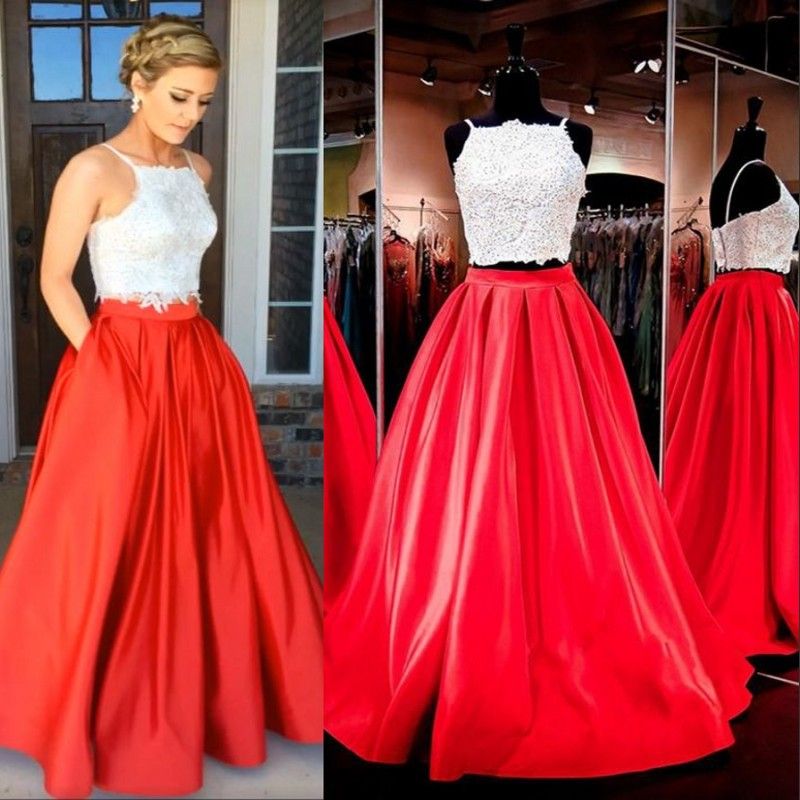 Cheap Modest Two Pieces White Red Lace Satin Prom Dresses Evening