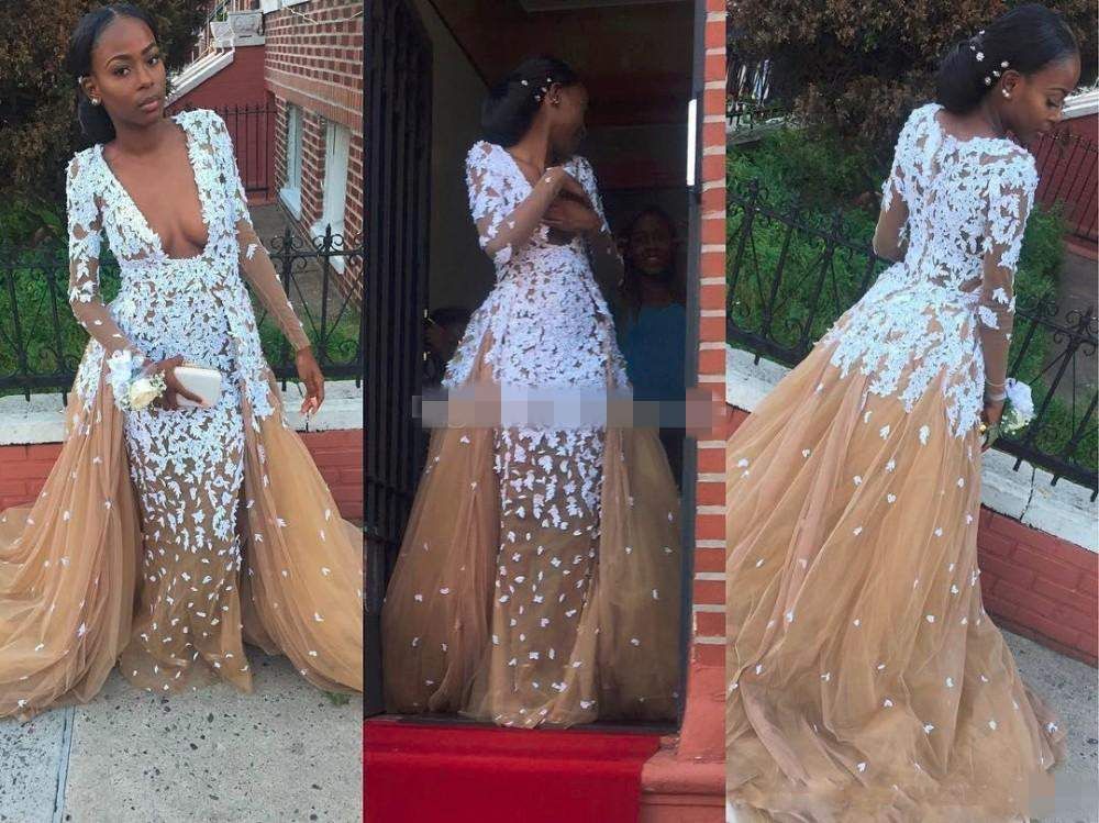 2017 Sexy Gold Mermaid Black Girls Prom Dresses Long Sleeves