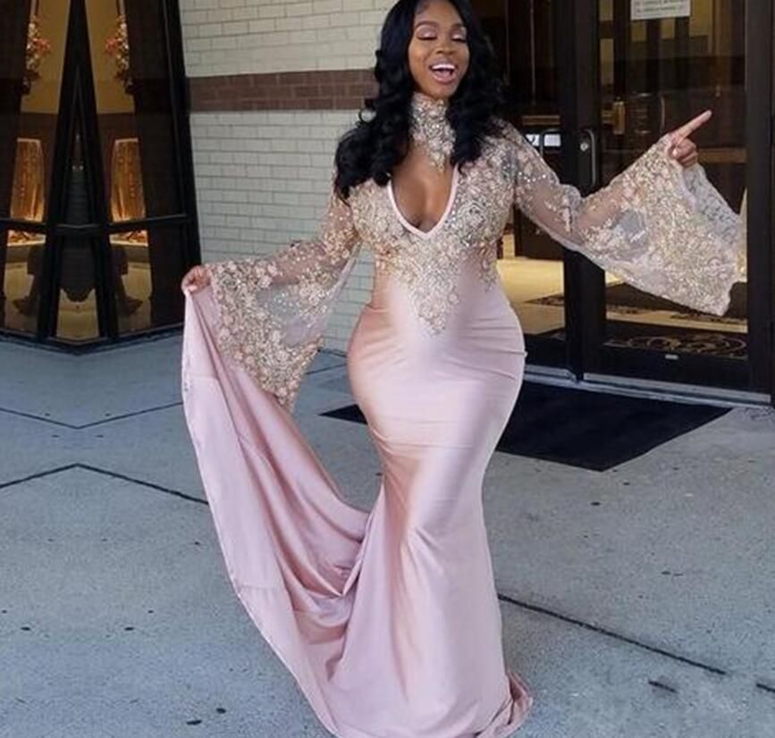 Pink Long Sleeves Black Girls Prom Dresses 2019 Mermaid Formal