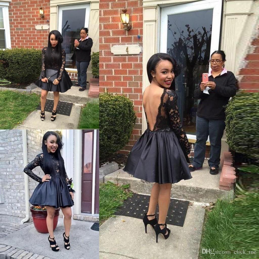 Black Girl Long Sleeve Homecoming Dresses Backless Lace Short Mini